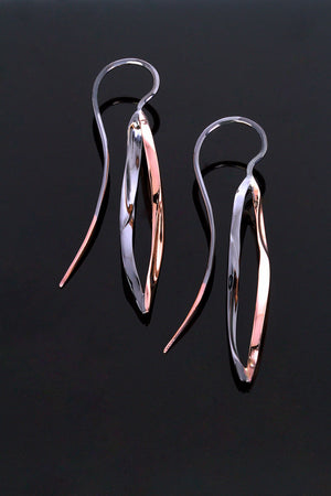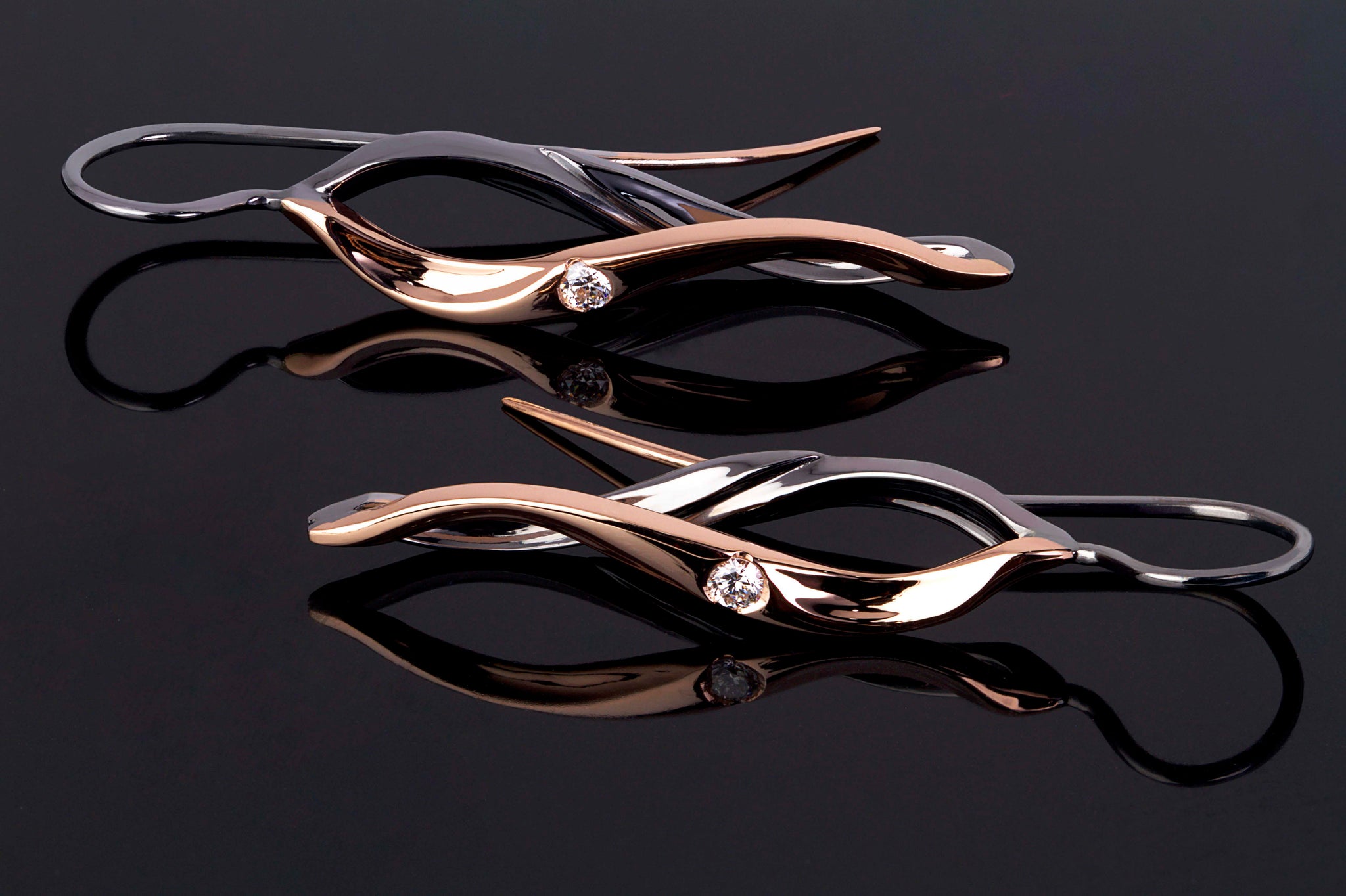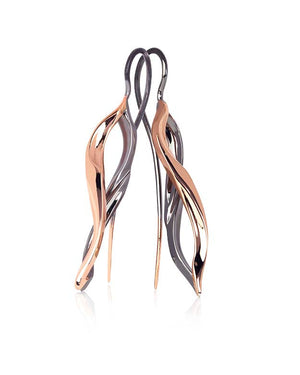 Matthew's Australian Diamond Guild 2018 Award winning design "Flame" in a scaled down petite version. These stunning earrings were inspired by the way a flame flickers and is constantly moving. The diamond and non diamond set versions of this product have been photographed crafted in the 18ct Rose Gold with a Black Rhodium finish.