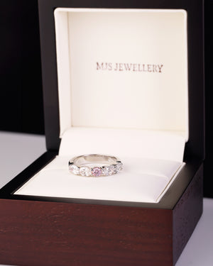 A stunning Argyle mine Pink Diamond and Oval Diamond set band handcrafted in platinum that features a certified Argyle mine origin .017ct Round Brilliant Cut Pink Diamond (FPP) and four matched oval cut diamonds in a shared twin claw setting. This band has been handcrafted by Matthew in our James Street Studio.
