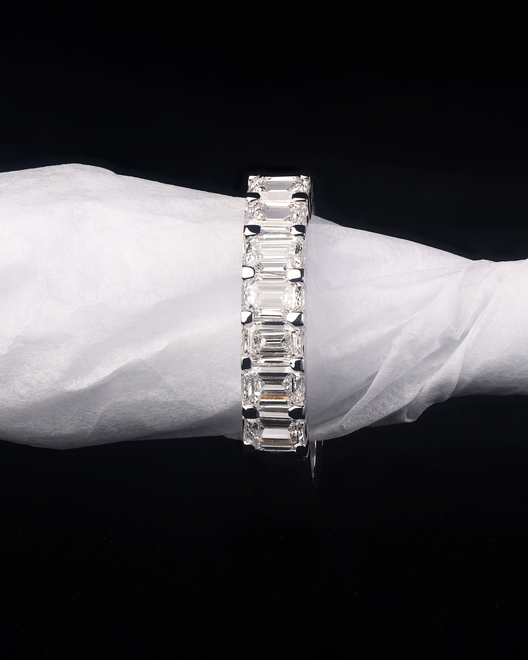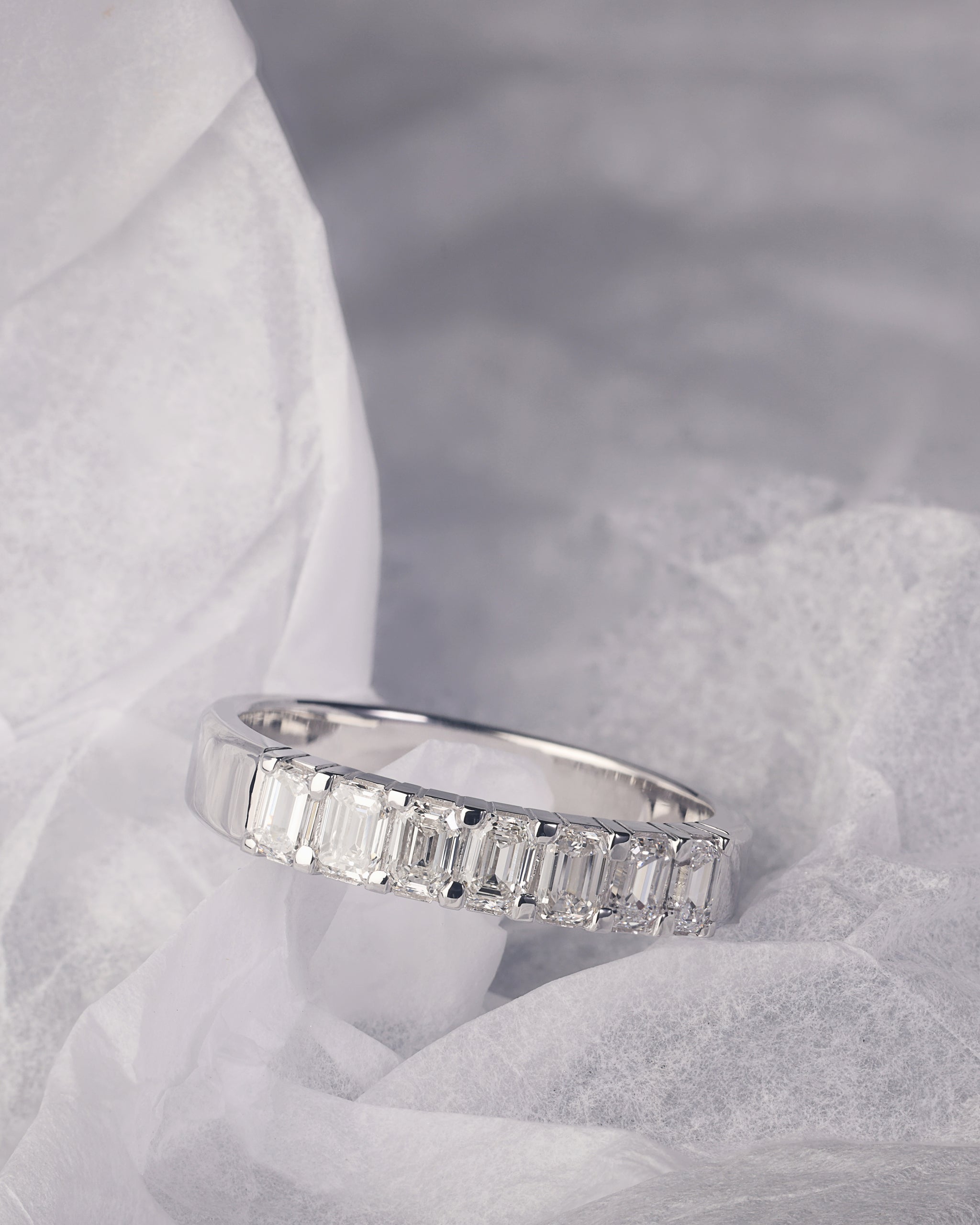 A stunning ladies 18ct white gold handcrafted diamond set band that features seven Emerald Cut Diamonds in a shared single claw setting. This band has been handcrafted by Matthew in our James Street Studio. It can be worn as a wedding band, eternity band, stand alone or a new addition to your stacking bands.