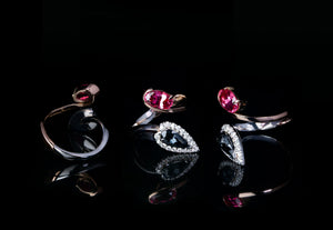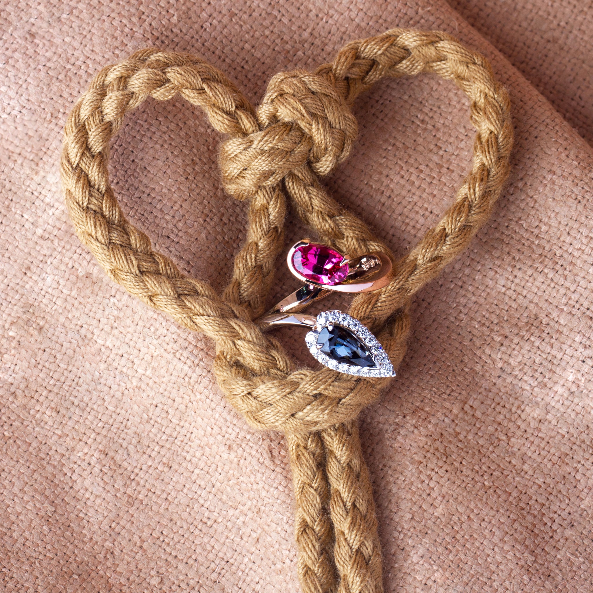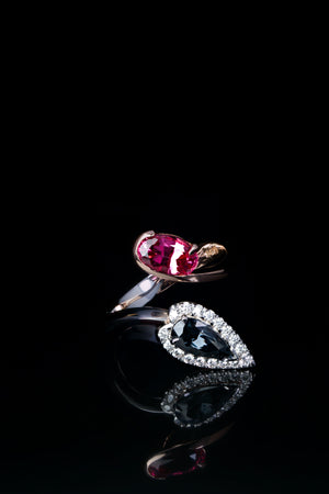 A bespoke sculptured design featuring a beautiful bright oval cut Mehenge pink spinel and Pear cut grey spinel surrounded by a halo of round brilliant cut diamonds. Designed to wrap and twist around the finger, this stunning unique design has been handcrafted by Matthew in Platinum and 18ct rose gold.