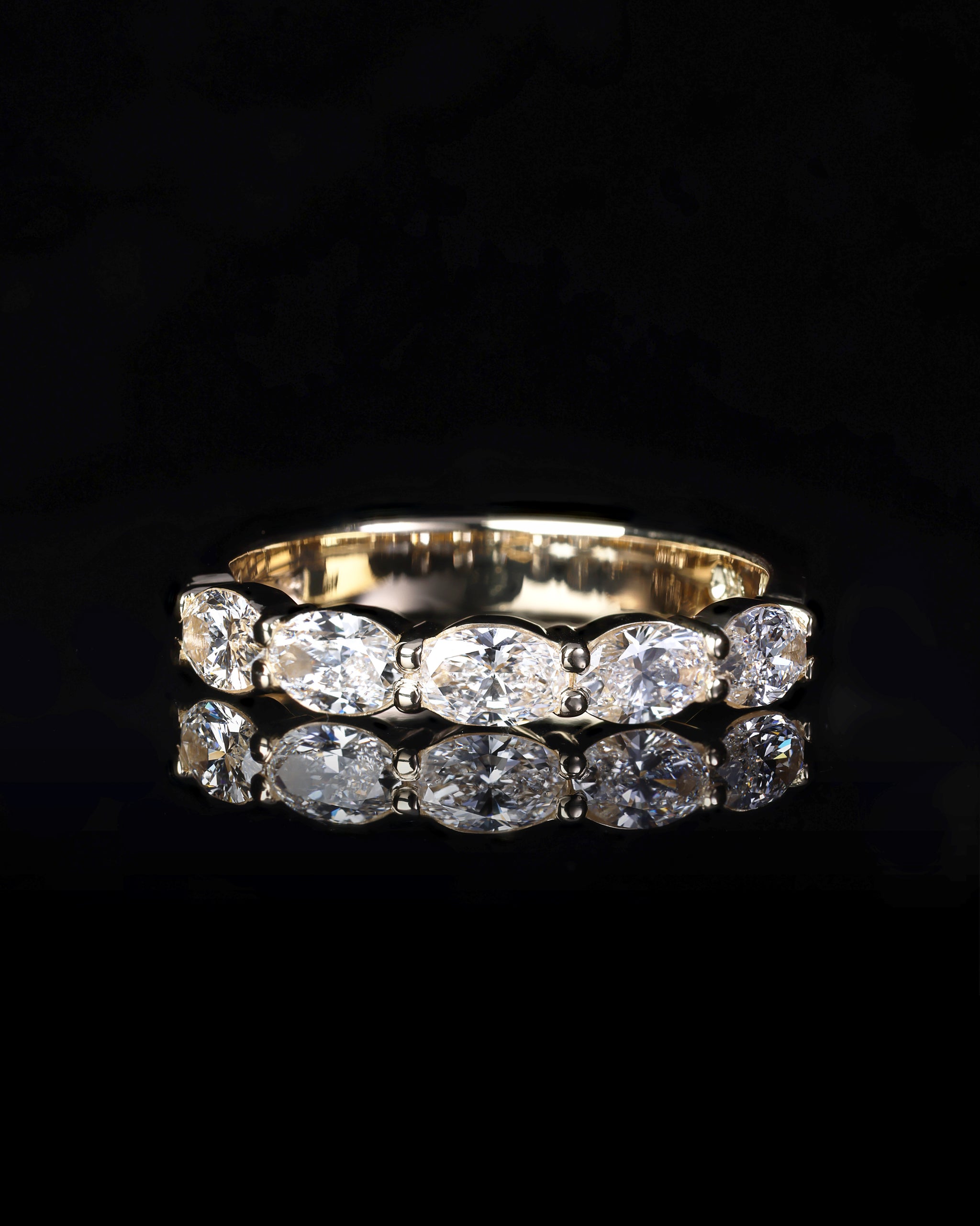 Ladies handcrafted band featuring five Oval Diamonds set east-west in a shared claw setting. Handcrafted by Matthew in 18ct yellow Gold.